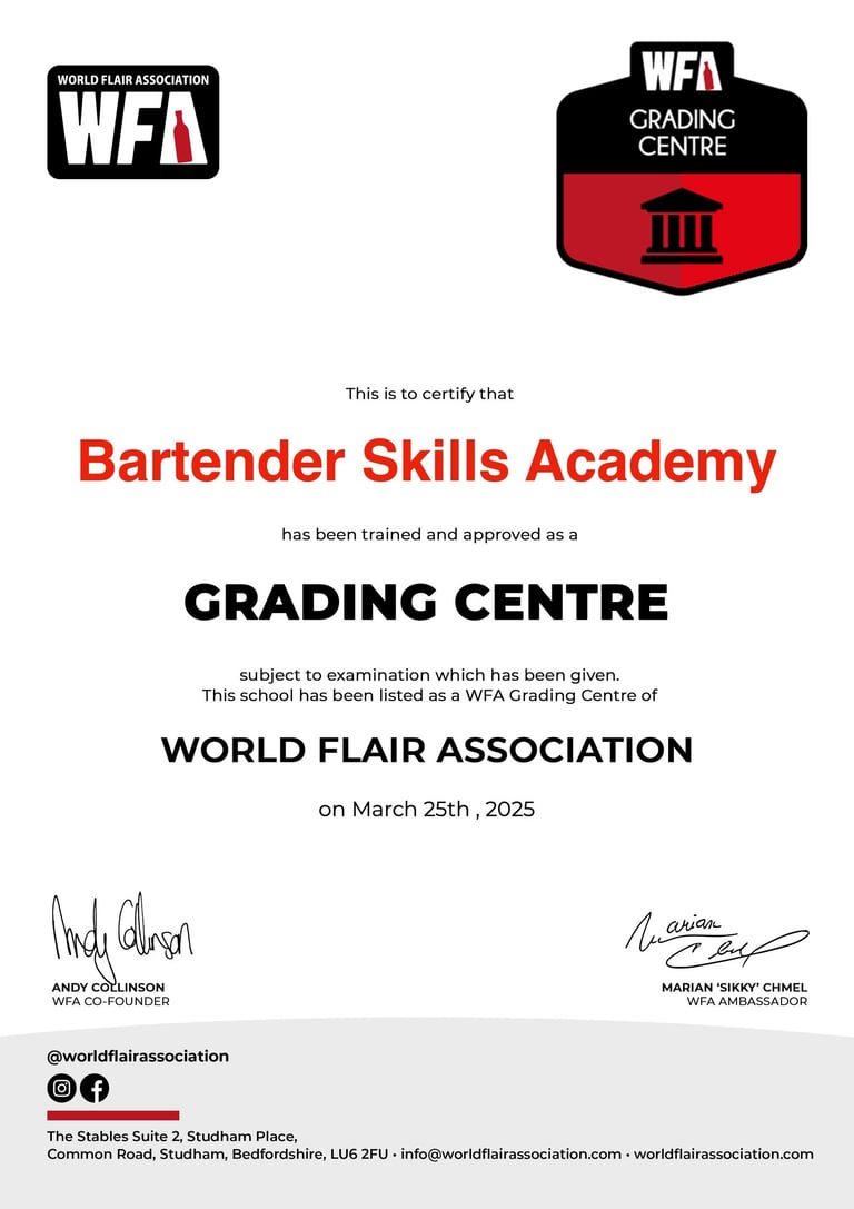 Al termine del corso riceverai attestato finale di partecipazione Bartender Skills Academy (Centro WFA Grading).